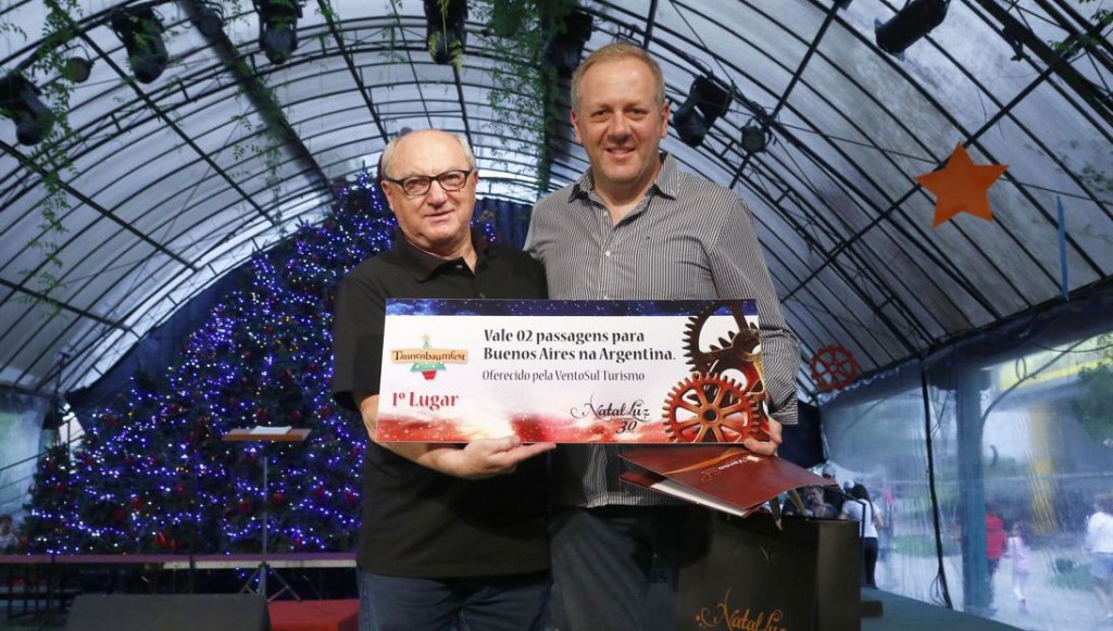 Aconteceu no final da tarde de domingo (27), a entrega do prêmio ao pinheiro destaque no Tannenbaumfest. Como mais destacado do natal Luz 30 anos foi o pinheiro decorado pelo Hotel Alpestre, que participa do evento há 22 anos. O Gerente do Alpestre, Mauro Valmórbida, recebeu a premiação oferecida pela Vento Sul Turismo (Agência Oficial do 30º Natal Luz), duas passagens aéreas para Buenos Aires na Argentina. Mauro disse estar muito contente com a premiação. “Muito feliz, contente mesmo…por se tratar dos 30 anos do evento, e é importante levar o nome da empresa para a principal Avenida de Gramado, bem como participar do maior evento de Gramado”, disse ele. Os critérios adotados para a premiação foram beleza, criatividade, originalidade e manutenção. A premiação foi entregue pelo Presidente da Gramadotur, João Pedro Till.