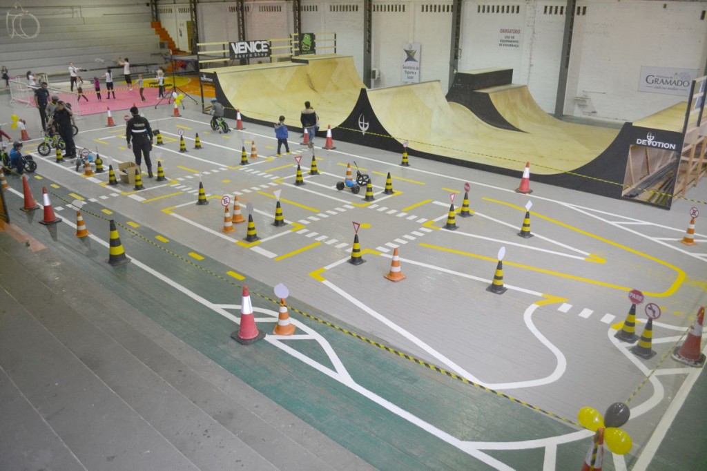 Foi inaugurada na manhã desta segunda-feira (19), a Escolinha de Trânsito de Gramado com o lema “Formando bons Cidadãos”. As crianças que participaram da aula inaugural do espaço receberam dos Agentes de Trânsito noções básicas e regras de trânsito, simulando situações do cotidiano, demonstrando a importância da sinalização viária, direitos e deveres dos pedestres. “A ideia é ensinar brincando, educar agora para não punir depois”, destacou a Agente Simone Backes Arend. O projeto é realizado pela Secretaria Municipal de Trânsito e fica no pavilhão em anexo a Prefeitura. Com ruas que lembram a parte central da cidade, as crianças de 5 a 10 anos circularão pelo espaço em equipamentos como triciclos e bicicletas, devendo obedecer as faixas de pedestres, placas de sinalização e ruas de sentido único. As aulas acontecerão nas terças e quintas-feiras, com duração de 40 minutos com turmas de até 20 crianças e monitoradas pelos Agentes.