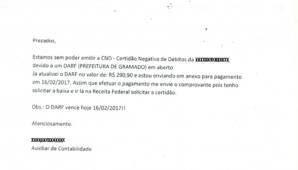 – O estelionatário envia para a vítima um ofício falsificado grosseiramente, onde se identifica como auxiliar de contabilidade do Município. O ofício solicita o pagamento de uma guia do Documento de Arrecadação de Receitas Federais – DARF, para a emissão de uma Certidão Negativa de Débitos – CND. O ofício sequer tem algum timbre, carimbo ou assinatura.