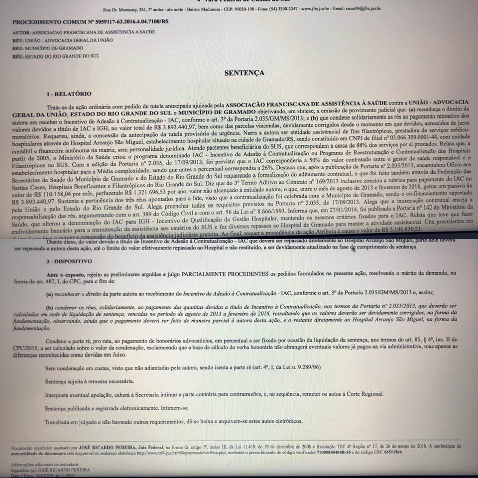 Segundo publicado em seu perfil pessoal no facebook, o advogado Rodolfo Gehlen de Brito diz que a Associação Franciscana de Assistência à Saúde -SEFAS, após ter sofrido intervenção em sua Unidade de Gramado, o Hospital Arcanjo São Miguel, em 29/02/2016, enaltece a importância da Sentença proferida pelo Juiz Federal José Ricardo Pereira, da 4ª Vara […]