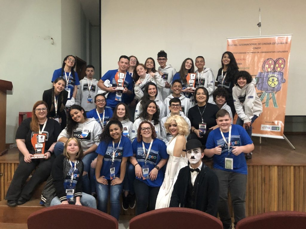 O Programa Municipal de Escola de Cinema (Educavídeo) recebeu três troféus no Festival Internacional de Cinema Estudantil (Cinest), em Santa Maria: um como programa homenageado e dois com o curta-metragem “As Aventuras de uma Família da Colônia”, estes na categoria Ensino Fundamental, de 5º ao 9º ano. O Cinest é realizado desde 2012 e todos os anos homenageia professores e projetos que incentivem a produção de audiovisuais como ferramenta pedagógica. Para a professora Ivanilda Rosa, a homenagem significa um marco importante para o programa. – No ano que vem completamos 10 anos de atuação e entendemos, como equipe, que esta homenagem do Cinest é o ponto de partida para realizarmos atividades e eventos em comemoração a uma década de produções com os alunos – diz. Nesta edição do Cinest, o Educavídeo teve cinco produções selecionadas para exibição: “Força Feminina”, “Adágio – um salto antes da hora”, “Elementos”, “Perfil Anônimo” e “As Aventuras de uma Família da Colônia”.