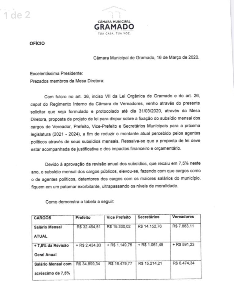 Após ofício do vereador Dr. Ubiratã (Progressistas), a Mesa Diretora da Câmara de Vereadores está estudando a apresentação de projeto de lei para redução do salário do prefeito, vice-prefeito, secretários e vereadores de Gramado. O prazo final para protocolo é 31 de março, e a publicação da lei precisa ser feita até o dia 30 de junho, 180 dias antes do final do mandato.