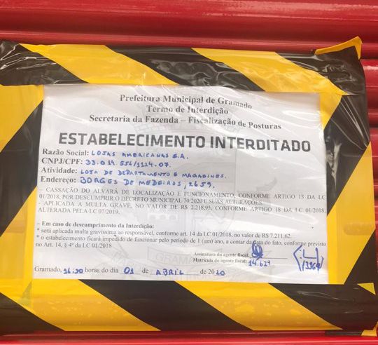 A Prefeitura de Gramado interditou as Lojas Americanas no centro de Gramado. Segundo informações eles foram denunciados pois estavam atendendo com acesso de uma pessoa por vez na loja. Os fiscais emitiram um documento de interdição e com a possiblidade de cassação do alvará conforme artigo 1º da Lei Complementar 1/2018 por descumprir o decreto […]