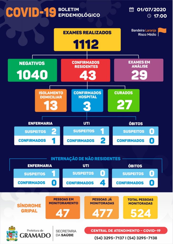 O boletim epidemiológico do Centro de Operações de Emergências (COE) Gramado desta quarta-feira, dia 1º, registra mais oito casos positivos para Covid-19 no município. Até o momento são 43 registros positivos, sendo 27 recuperados e 13 em isolamento domiciliar. Já foram realizadas 1112 testagens, com 1040 resultados negativos. A UTI do Hospital São Miguel continua […]