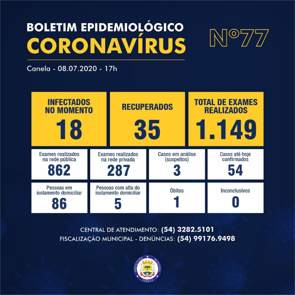 Entre esta terça-feira (07) e hoje (08), foram realizado em Canelas 18 novos exames, sendo que dois apontaram positivo. Um paciente é assintomático e o outro apresenta sintomas leves. Um paciente foi recuperado, ao todo, 35 já são considerados curados. Atualmente há 18 pessoas infectadas. Um paciente segue hospitalizado. Fonte – Prefeitura de Canela/Portal da […]