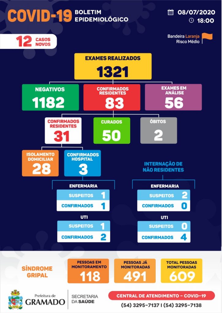 O boletim epidemiológico do Centro de Operações de Emergências (COE) de Gramado desta quarta-feira, dia 8, confirma 12 novos resultados positivos no município para Covid-19. No total, Gramado apresenta 83 testagens positivas, sendo 50 pacientes já recuperados e outros 28 moradores em isolamento domiciliar. O Hospital Arcanjo São Miguel está, ainda, com três casos de […]