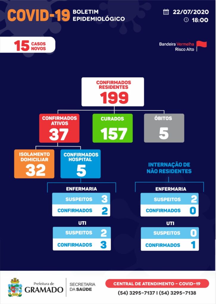 O boletim epidemiológico do Centro de Operações de Emergências (COE) de Gramado desta quarta-feira, dia 22, confirma 15 casos novos para Covid-19. Com isso, há 199 testagens positivas para residentes de Gramado. De ontem para hoje houve uma recuperação de 20 pacientes. No total, 157 positivos já estão curados. Entre os confirmados ativos, 32 moradores […]