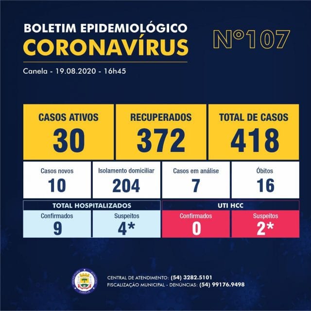 Em boletim divulgado na tarde desta quarta-feira (19), o município registrou que 10 testes resultaram positivo. Com isso, Canela chega a 418 casos confirmados. A boa notícia é que novamente o número de pacientes recuperados foi superior ao de novos casos. Nas últimas 24 horas, 12 pacientes foram liberados, sendo considerados curados. Ao todo, 372 […]