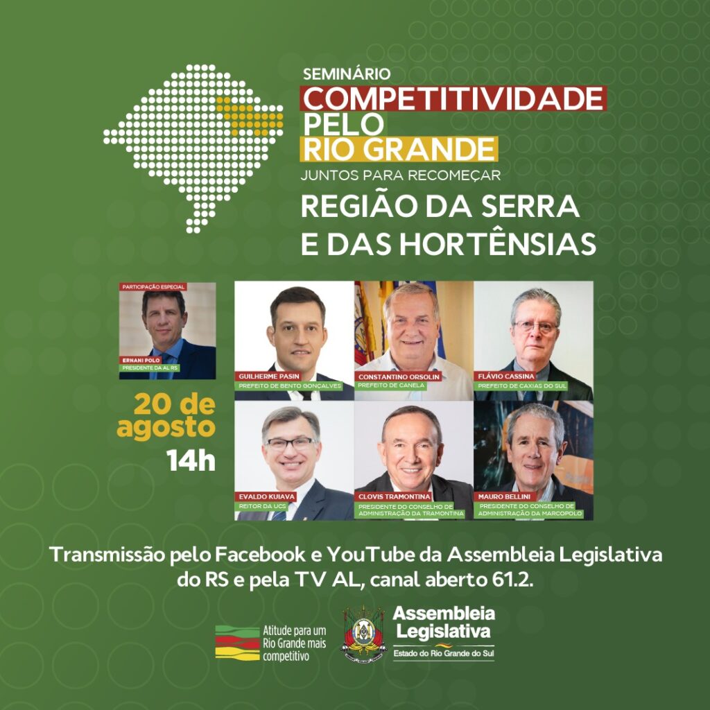 O prefeito de Canela, Constantino Orsolin, é um dos convidados para o seminário Competitividade pelo Rio Grande – Juntos para recomeçar, promovido pela Assembleia Legislativa do Estado. O evento virtual será nesta quinta-feira (20), às 14 horas, com transmissão pelo Facebook, pelo canal no Youtube e pela TV do legislativo gaúcho. O assunto do seminário é […]