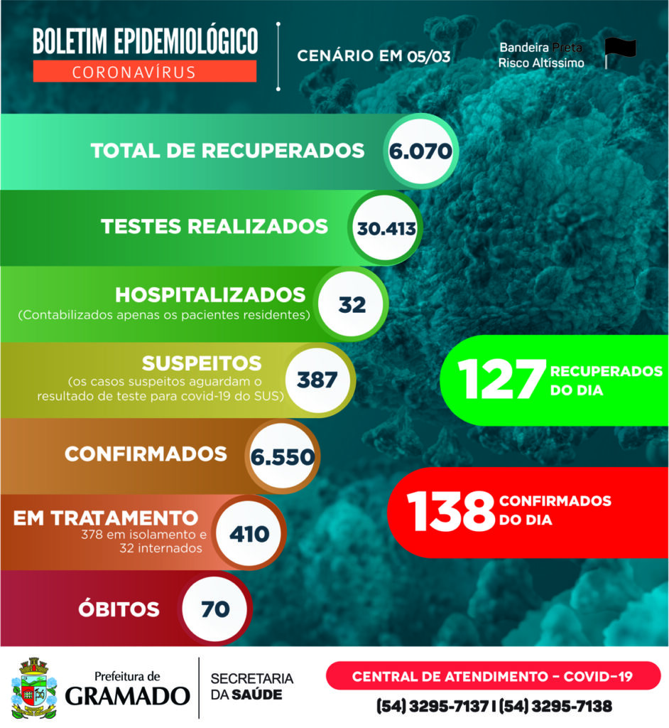 A Prefeitura de Gramado, por meio do Centro de Operações de Emergência (COE) Gramado, divulgou, nesta sexta-feira (05), novo boletim epidemiológico, que apresenta 138 novos casos positivos confirmados para o coronavírus (Covid-19) e 127 pacientes evoluindo para o status de recuperados. Desta maneira, são 410 casos ativos neste momento na cidade. Foram registrados quatro óbitos hoje, três gramadenses e um canelense.