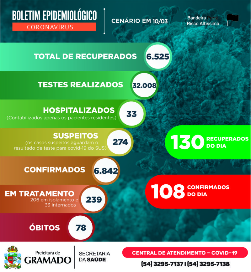 O boletim epidemiológico divulgado pela Prefeitura de Gramado apresenta pelo terceiro dia consecutivo um total de pacientes recuperados maior que de infectados pelo novo coronavírus (Covid-19). Nesta quarta-feira (10), o COE registrou 108 novos casos e 130 recuperados da doença. Ao todo, 239 gramadenses estão em tratamento, 206 em isolamento domiciliar e 33 internados no Hospital Arcanjo […]