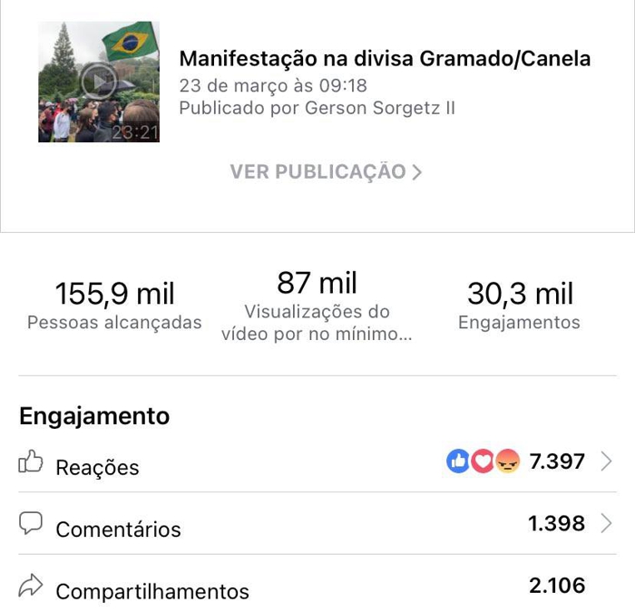 O Blog do Gerson esteve fazendo a cobertura das manifestações que aconteceram na manhã desta terça-feira, dia 23, em Gramado e Canela. E na ação que aconteceu na divisa das duas cidades, o Blog esteve fazendo a transmissão ao vivo. Tivemos uma grande audiência, a melhor da região, foram mais de 155,9 mil pessoas alcançadas, […]