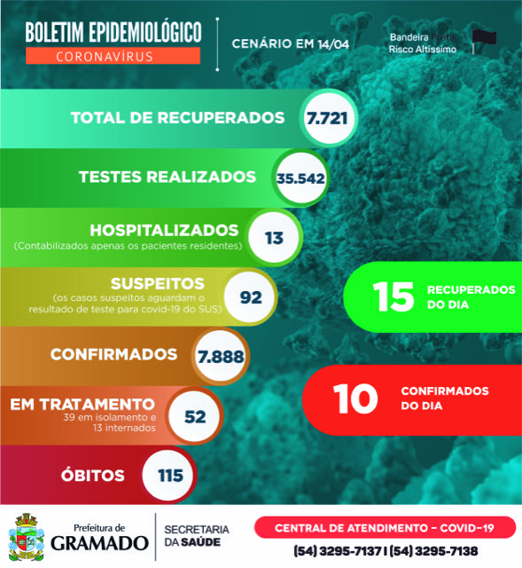 A Prefeitura de Gramado, através do Centro de Operações de Emergências (COE) Gramado, informou nesta quarta-feira (14), o registro de 10 novos casos e 15 registros de curados do coronavírus (Covid-19). Agora o município chega a 7.888 dos quais 7.721 já estão curados (97,88%), 167ainda estão com a doença e 115 infelizmente vieram a óbito. […]