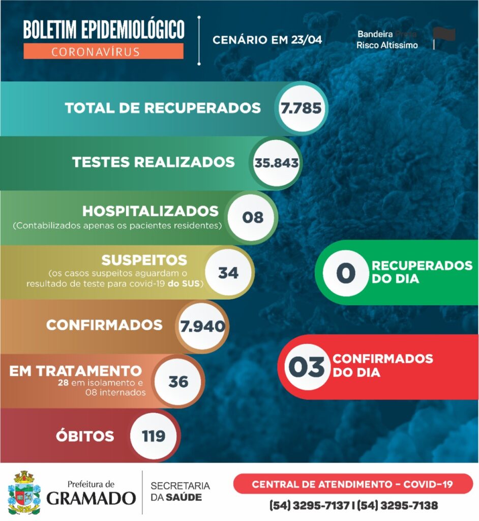 O boletim epidemiológico divulgado pelo Centro de Operações de Emergências (COE) Gramado, traz uma excelente notícia, apenas cinco pacientes moradores do município seguem internados na Unidade de Terapia Intensiva (UTI Covid-19) do Hospital Arcanjo São Miguel. Outros três pacientes estão internados na enfermaria especializada não necessitando de tratamento intensivo. Ainda há o registro de seis […]