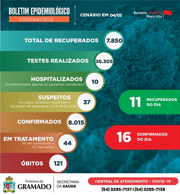 A Prefeitura de Gramado, por meio do Centro de Operações de Emergência (COE) Gramado, registra, nesta terça-feira (04), em novo boletim epidemiológico, a recuperação de 11 pessoas e 16 novos casos de coronavírus (Covid-19). De acordo com o Hospital Arcanjo São Miguel, dez gramadenses seguem internados, nove na Unidade de Terapia Intensiva (UTI) e um […]