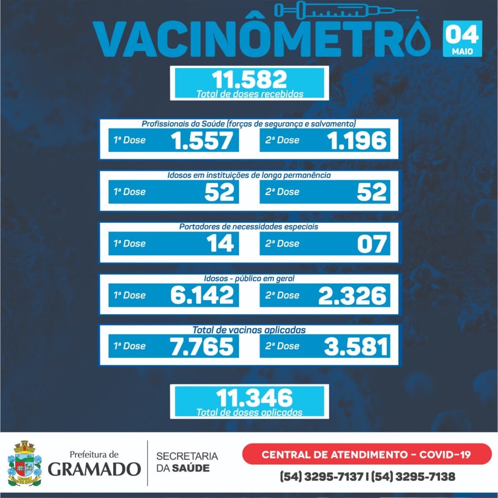 Até está terça-feira (04), das 11.582 doses recebidas, a Prefeitura de Gramado, por meio da Secretaria da Saúde, aplicou 11.346 doses da vacina contra o coronavírus (Covid-19). De acordo com o vacinômetro, 7.765 pessoas já tomaram a primeira dose e mais 3.581, com a segunda dose. Nesta segunda-feira (03), em nova edição do drive-thru de […]