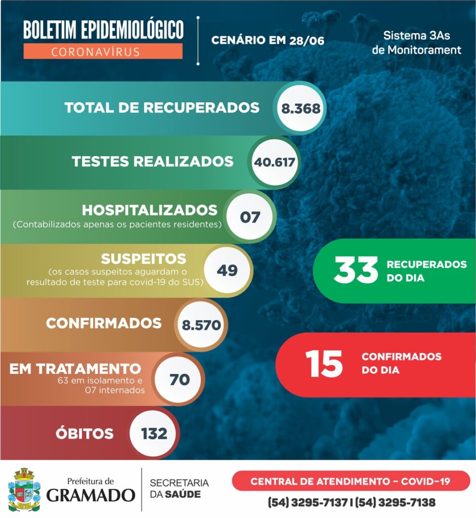 Em nova atualização do boletim epidemiológico, o Centro de Operações de Emergências (COE) Gramado, registrou nesta segunda-feira (28), 33 pacientes recuperados do coronavírus (Covid-19) e 15 novos casos da doença. Seguem em tratamento 70 moradores, sendo 63 em isolamento domiciliar e 7 internados no Hospital Arcanjo São Miguel (HASM). Dos pacientes hospitalizados, 5 estão na […]