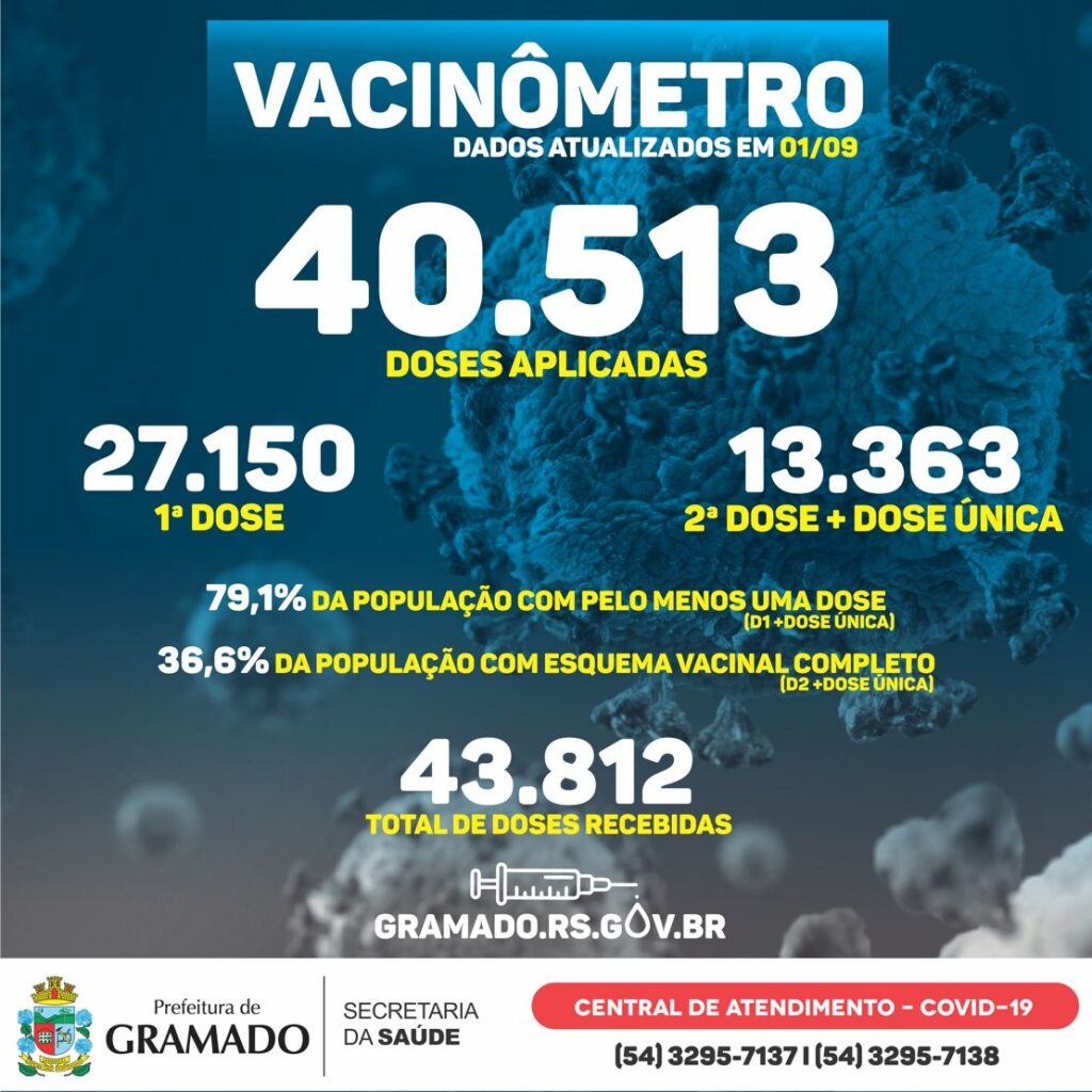 Recente atualização do “Vacinômetro” da Secretaria Estadual da Saúde (SES/RS), aponta que, das 43.812 doses da vacina contra o coronavírus (Covid-19) destinadas ao município, a Secretaria da Saúde de Gramado aplicou 40.513, sendo 28.665 de primeira dose e 12.410 de segunda dose. Ao todo, as equipes da Vigilância em Saúde, ao longo de sete meses, imunizaram 79.1%, […]