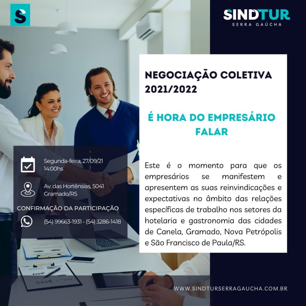 O Sindtur Serra Gaúcha está promovendo no dia 27 de setembro às 14 horas uma Assembleia Geral com os empresários do setor para se manifestarem em relação a negociação coletiva de trabalho 2021/2022. “Este é o momento para os empresários se manifestarem e apresentarem suas reivindicações e expectativas sobre o tema”, disse Lisa Gottschalk, Executiva […]