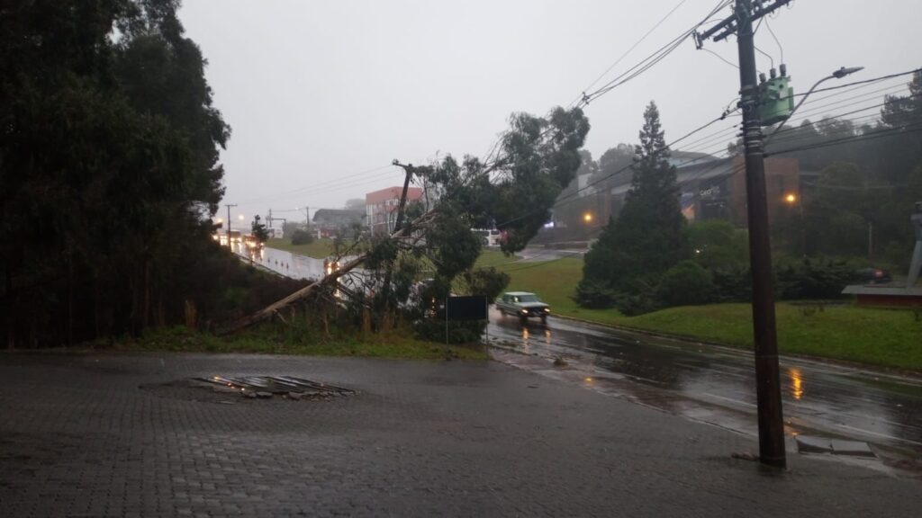 O mau tempo que atingiu todo estado fez estragos na Região das Hortênsias. Na Rodovia Canela-Gramado uma enorme árvore caiu sobre a rede de energia tornando o local perigoso para trânsito de veículos. As equipes trabalham no local. Foto – rede social