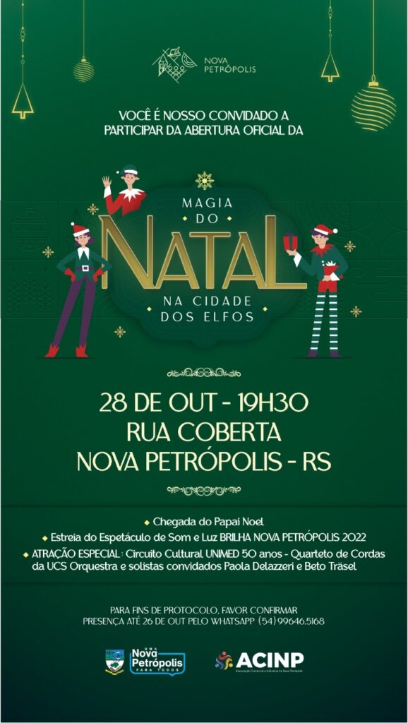 Nova Petrópolis dá início nesta sexta-feira, 28 de outubro, à edição 2022/2023 da Magia do Natal na Cidade dos Elfos. A noite de estreia do evento natalino reunirá uma série de atrações especiais na Rua Coberta e na Praça das Flores, entre as quais se destaca o concerto do Circuito Cultural Unimed 50 anos, com […]