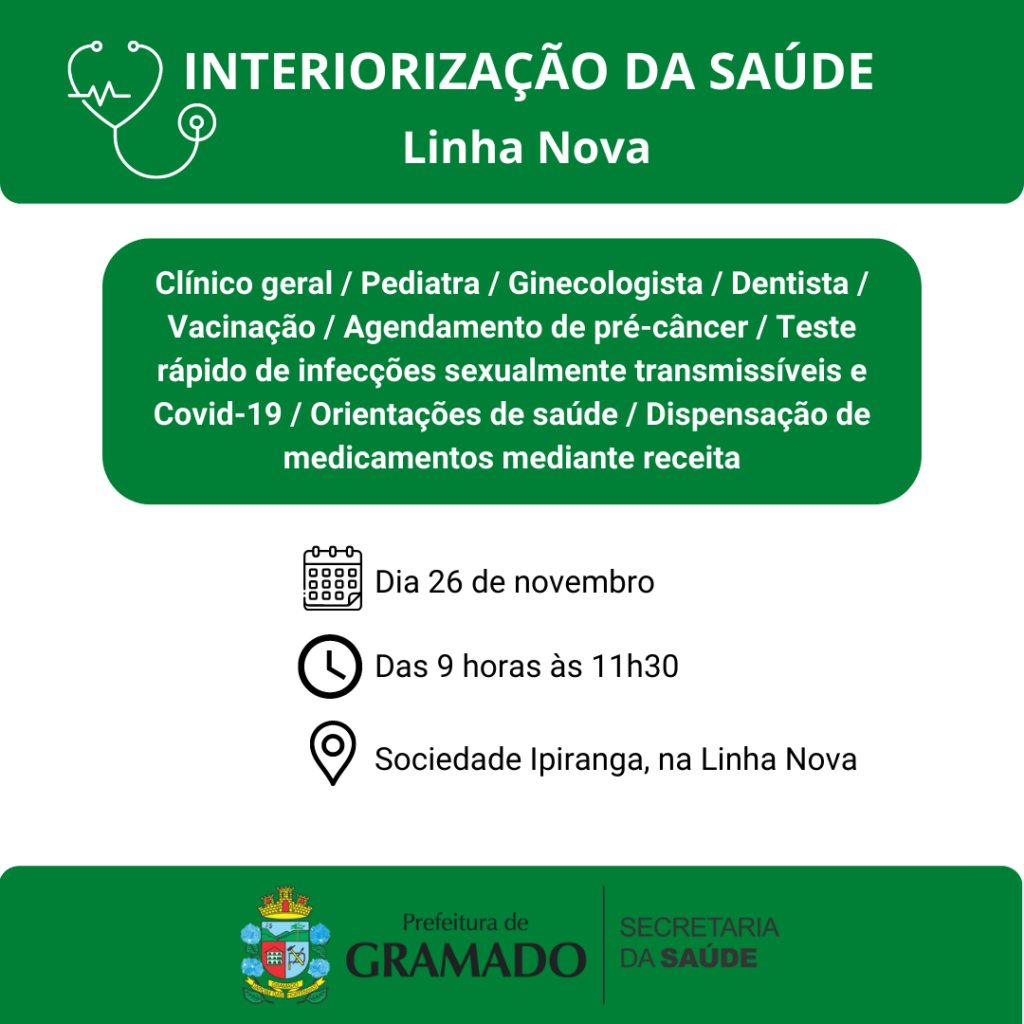 A Prefeitura de Gramado, por meio da Secretaria da Saúde, realiza no próximo sábado (26), das 9h às 11h30, mais uma ação de interiorização da saúde, levando atendimentos médicos à população do interior. Desta vez, a comunidade da Linha Nova poderá ir até a Sociedade Ipiranga para receber os serviços. Serão oferecidos atendimentos com clínico geral, pediatra, ginecologista […]