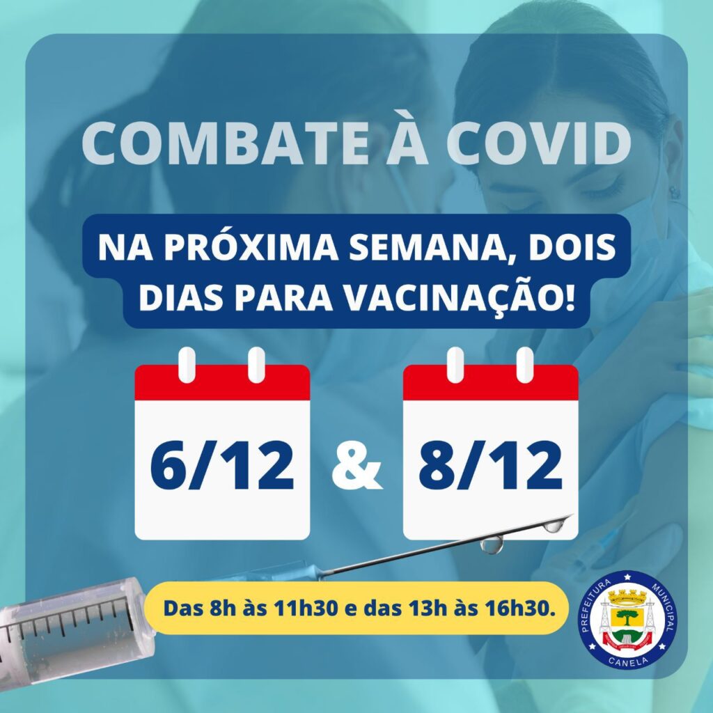 Nos dias 6 e 8 de dezembro, a Secretaria de Saúde de Canela realiza dois dias de vacinação contra Covid-19. O horário de atendimento em todas as unidades básicas de Saúde é das 8h às 11h30 e das 13h às 16h30. SEGUNDA DOSE Crianças de 3 a 11 anos (intervalo de dois meses após a […]