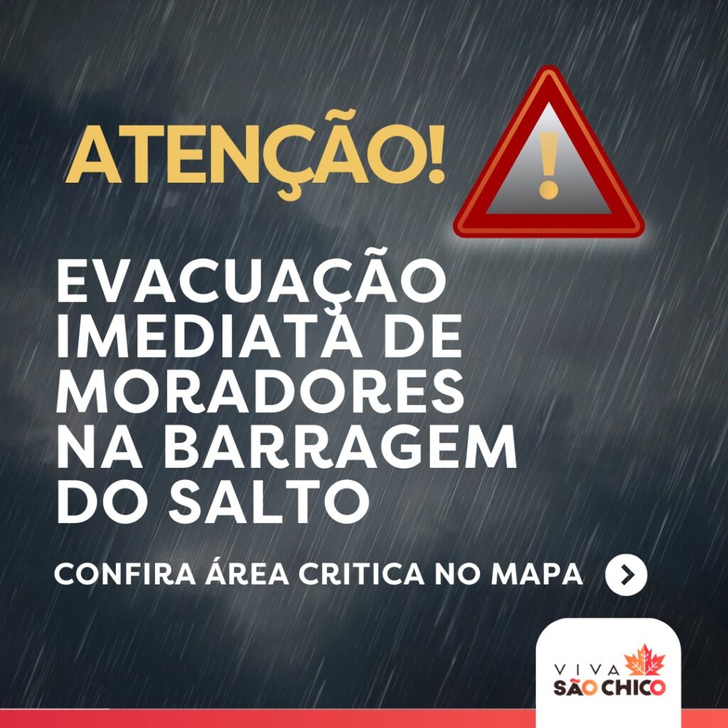 Segundo o prefeito, “há risco de deslizamento de encosta junto à barragem, provocando onda às margens do reservatório. Pedimos a todos os moradores do entorno da barragem do Salto que sigam as orientações de evacuação imediatamente. Para garantir a segurança de todos, sugerimos que se dirijam ao Centro do Idoso, localizado na rua Antônio Francisco Lisboa esquina com a rua Carlos Barbosa, atrás do Ginásio Municipal de Esportes, onde encontrarão abrigo e assistência”, foi a postagem nas redes sociais da Prefeitura de São Chico.