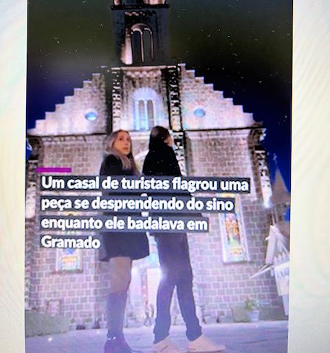 Casal de turistas flagram momento em que badalo de sino da Igreja São Pedro em Gramado se desprende e cai no pátio