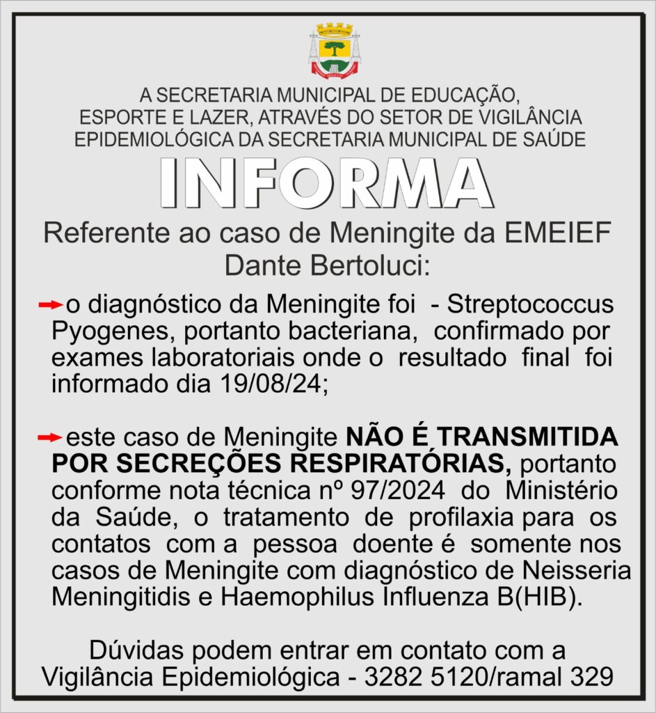 O óbito de um estudante em Canela gerou grande preocupação nas autoridades de saúde locais. O incidente, ocorrido na semana passada, foi confirmado como caso de meningite bacteriana, do tipo streptococcus pyogenes. A Secretaria de Saúde do município informou que está tomando medidas preventivas, especialmente na Escola Municipal Dante Bertoluci, onde a criança estudava, porém […]