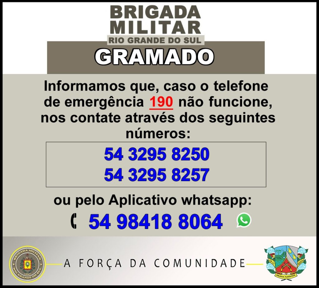 Tendo em vista a instabilidade do telefone de emergência 190, a Brigada Militar de Gramado informa e reforça outros números telefônicos para que a comunidade possa contatar a Instituição no munícipio, bem como o número de celular e aplicativo whatsapp: Telefones: (54) 32958250 e ou (54) 32958257Telefone celular e aplicativo whatsaap: (54) 984188064