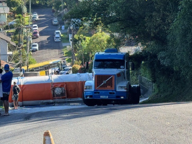 Uma carreta carregada de água tombou na manhã desta sexta-feira (27) na Rua Amazonas, uma das vias de entrada e saída do Bairro Dutra em Gramado. Segundo informações de moradores é uma rotina diária de caminhões carregados de água pelo bairro, pois são abastecidos em um ponto de poço artesiano existente naquela região. “Toda hora passa caminhão aqui na frente da minha casa carregado de água”, disse ao Blog uma moradora.
