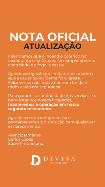 Segundo Nota Oficial do Resort, o fogo atingiu “o restaurante Lalo Cabana e felizmente não houve feridos”. Conforme a direção do empreendimento, “todas as providencias para garantir a segurança de todos já foram tomadas e será feito o possível para manter a operação funcionando com a maior normalidade”. Abaixo Nota Oficial atualizada da direção do Resort: