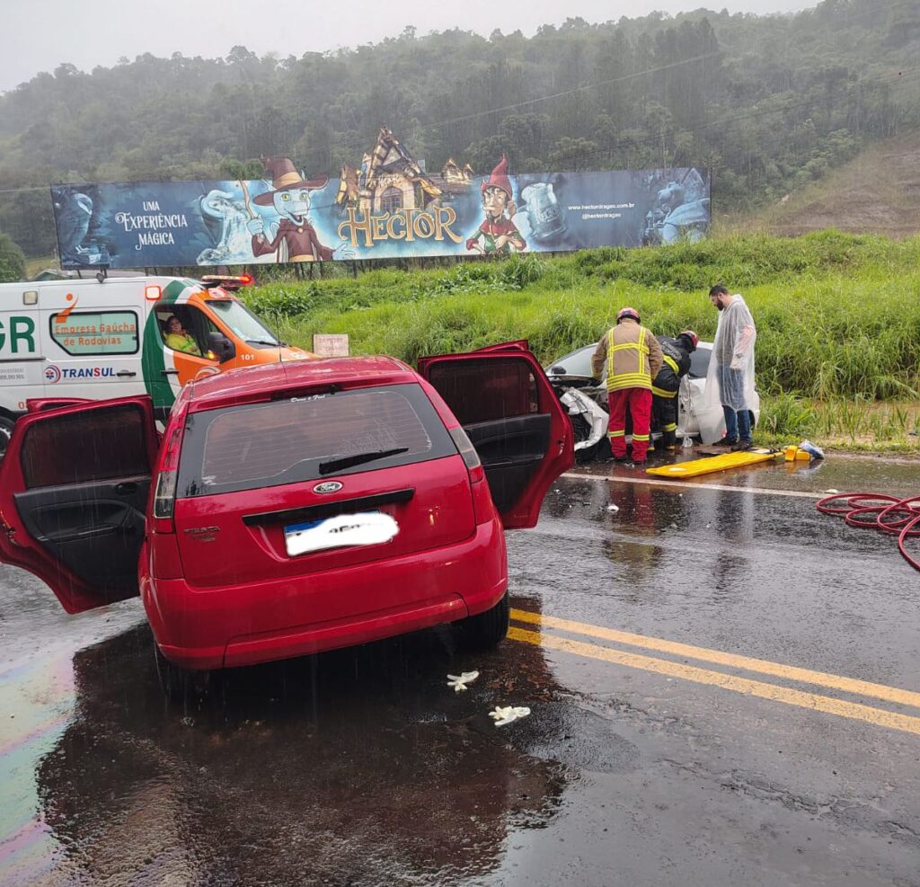 As duas pistas ficaram bloqueadas no Km 15 da RS 115 a cerca de 300 metros da Cervejaria Heineken. No acidente, o choque aconteceu entre um Ford ka e um Ford Fiesta. Chovia muito no momento do acidente.