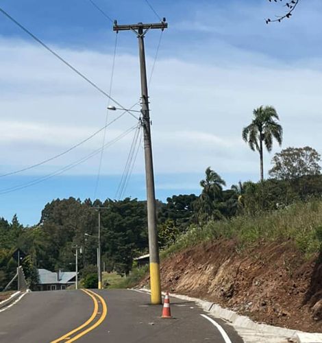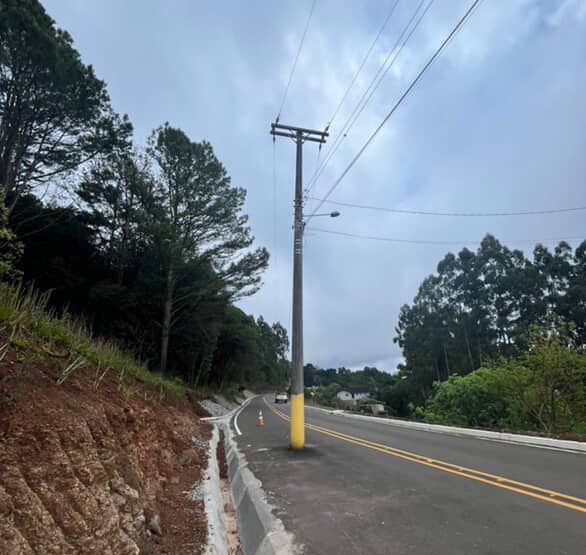 A obra do asfalto pela Prefeitura de Gramado foi iniciada em março e foi logo concluída. Agora a RGE precisa fazer o deslocamento dos dois postes para a lateral da via, o que não aconteceu ainda. Um dos postes está no sentido centro/bairro e outro no lado inverso.