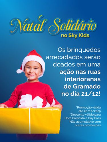 A Rede Sky de Hotéis está promovendo o Natal Solidário que acontece no Sky Kids Mega Park, um parque infantil repleto de brinquedos, ambiente tematizado e monitoras que realizam atividades e brincadeiras. O parque é voltado para crianças de 0 a 12 anos, sendo válida nesta campanha todos os públicos: visitantes, hóspedes da Sky Hotéis e moradores de Gramado, Canela e Nova Petrópolis. Ao trazer um brinquedo novo ou em bom estado, a criança terá 50% de desconto no ingresso ao Sky Kids.