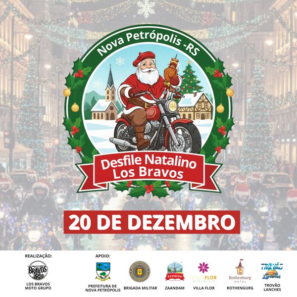Nova Petrópolis viverá uma noite especial no próximo sábado, 20 de dezembro, a partir das 21h, com a realização do Desfile de Natal do grupo Los Bravos, que promete encantar moradores e visitantes com um grande comboio de motocicletas decoradas e iluminadas com luzes natalinas. A previsão é de que mais de 250 motociclistas participem do […]