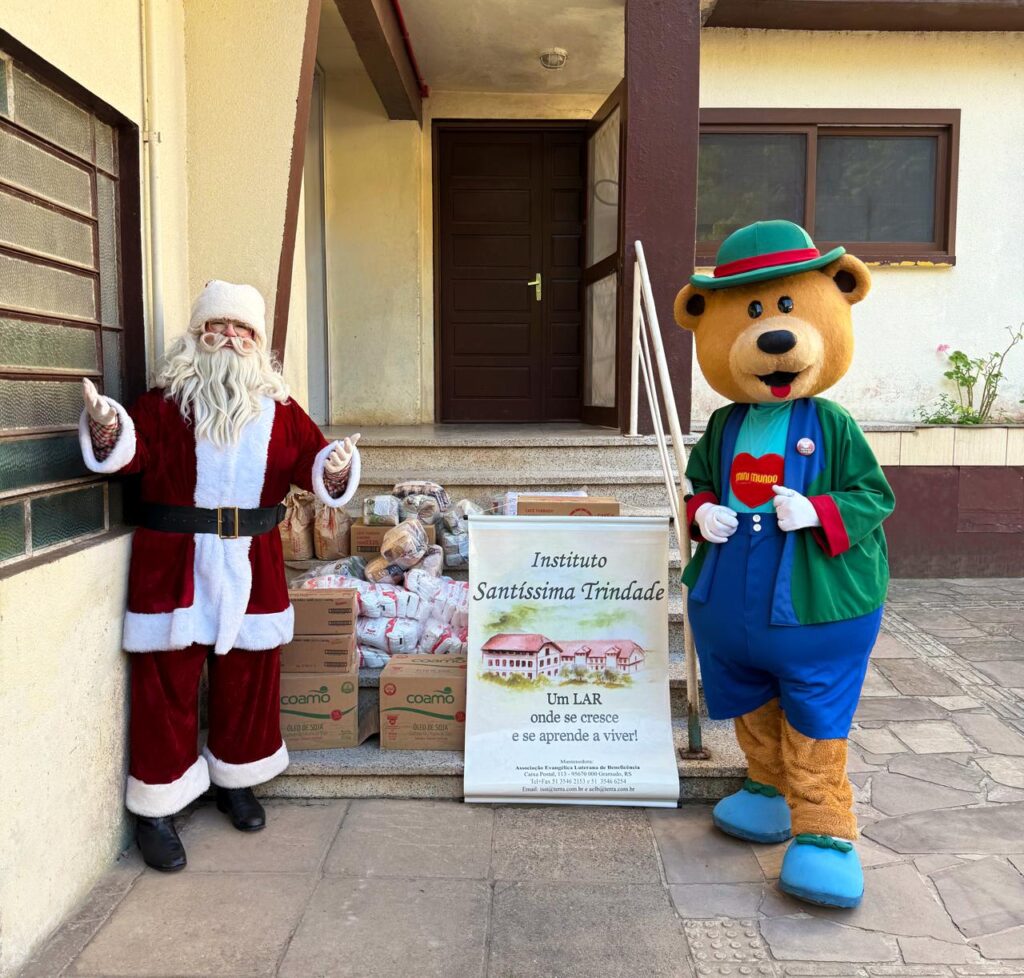 Na imagem – Urso Gui visitou o Instituto Santíssima Trindade Moreira para fazer as doações