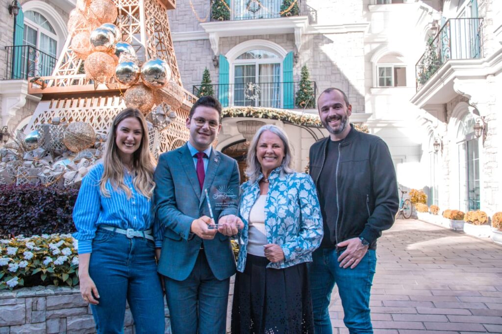 O gerente do Colline de France, Matheus Selau, recebeu na tarde desta quarta-feira (15), o troféu Brilha Gramado, que foi entregue pela diretora da Cristais de Gramado, Irane Land, pela Executiva do Sindtur, Lisa Gottschalk, e pelo diretor de Eventos da Gramadotur, Stefano Roldo. Além do troféu produzido pela Cristais de Gramado, a decoração vencedora recebeu R$ 10 mil em premiação.