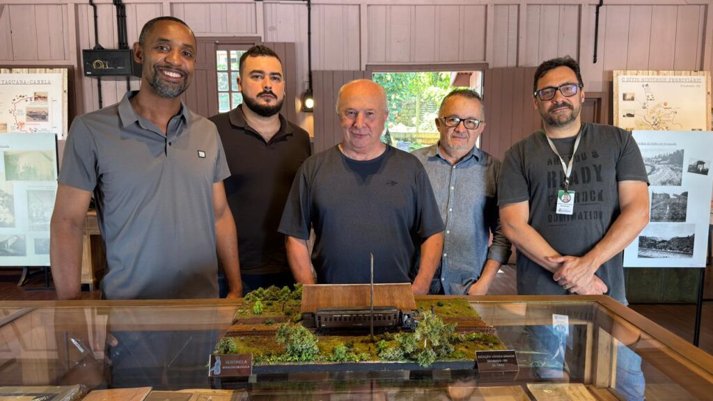O vice-prefeito Luia Barbacovi e o secretário da Cultura e Economia Criativa, Jonas da Silva, estiveram no Museu Estação Férrea Várzea Grande, popularmente conhecido como Museu do Trem, na quarta-feira (4), para acompanhar um importante ato de contribuição voluntária com o acervo do espaço cultural. Na ocasião, o porto-alegrense Tiago Silva oficializou a doação de uma maquete da Estação da Várzea Grande, com uma composição ferroviária representando a transição da antiga Viação Férrea (VFRGS) para a Rede Ferroviária Federal (RFFSA), que ocorreu no final da década de 1950.