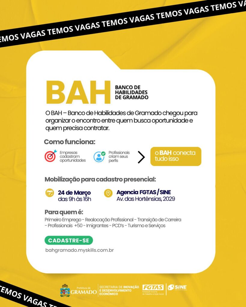 Ação ocorre amanhã (24), das 9h às 16h, por meio de uma parceria entre a Secretaria de Inovação e a empresa MySkills! O BAH – Banco de Habilidades de Gramado by MySkills (bahgramado.myskills.com.br) já está conectando empresas e profissionais em um único ambiente digital, organizando currículos, habilidades e vagas para fortalecer o desenvolvimento econômico e […]