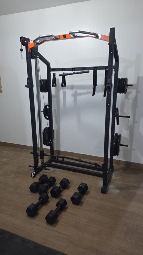O equipamento doado, um rack monocross multifuncional, é uma estação de treinamento de alto desempenho que proporciona treinos completos e seguros. Construída em metalon e aço SAE 1020, sua estrutura é robusta e compacta, sendo ideal para espaços otimizados sem abrir mão da estabilidade e segurança. Com 2,16 metros de altura e capacidade de suporte de até 200 kg nas barras, o equipamento oferece versatilidade profissional para atender a diversos objetivos de treino, por meio de ajustes rápidos e intuitivos. A estação permite a execução de mais de 50 exercícios, entre eles agachamento livre, supino, puxadas, remadas, desenvolvimento, cadeira extensora, flexora e crossover.