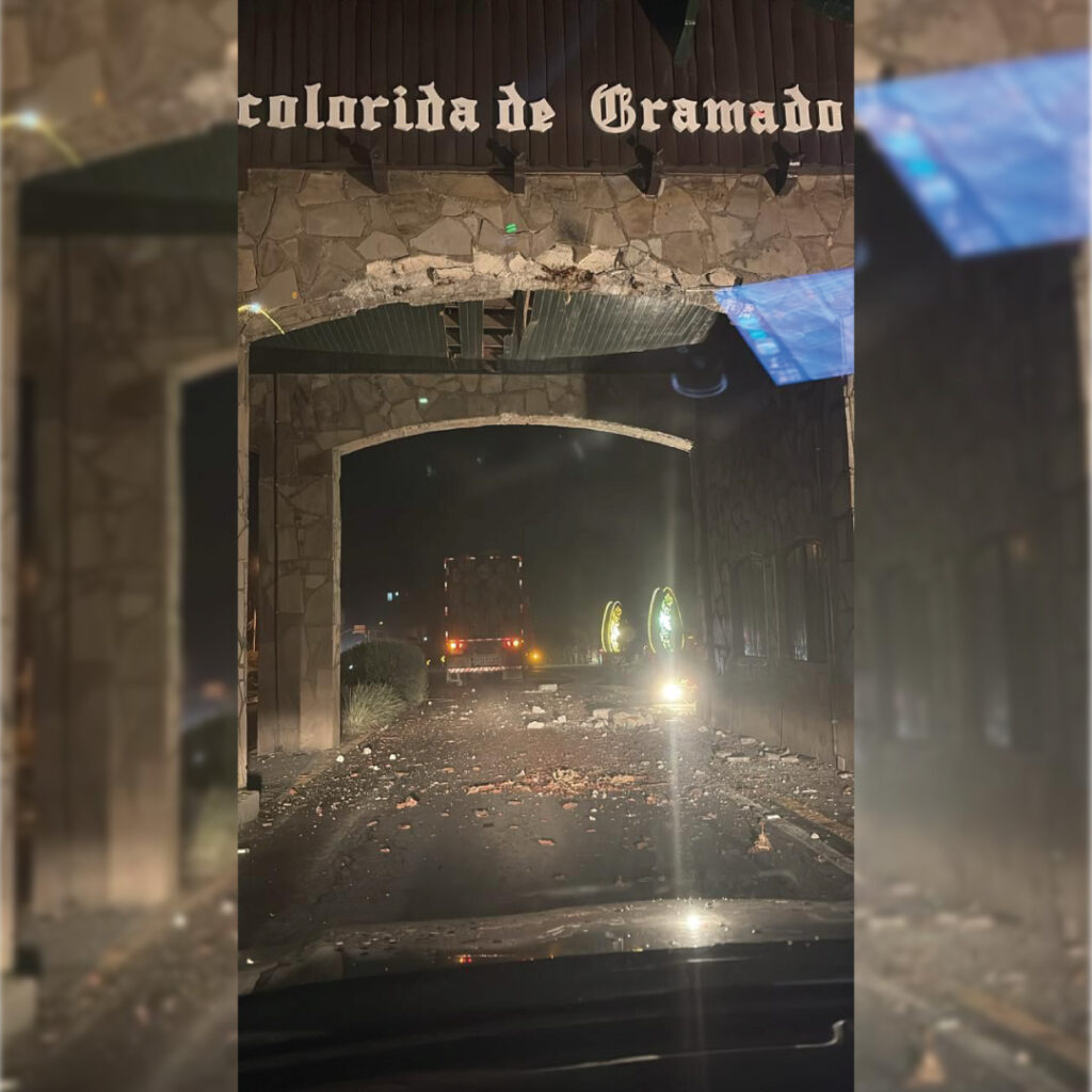 A estrutura superior do pórtico foi parcialmente danificada.