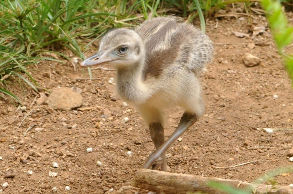 Filhote de ema é cuidado por dois pais no Gramadozoo
