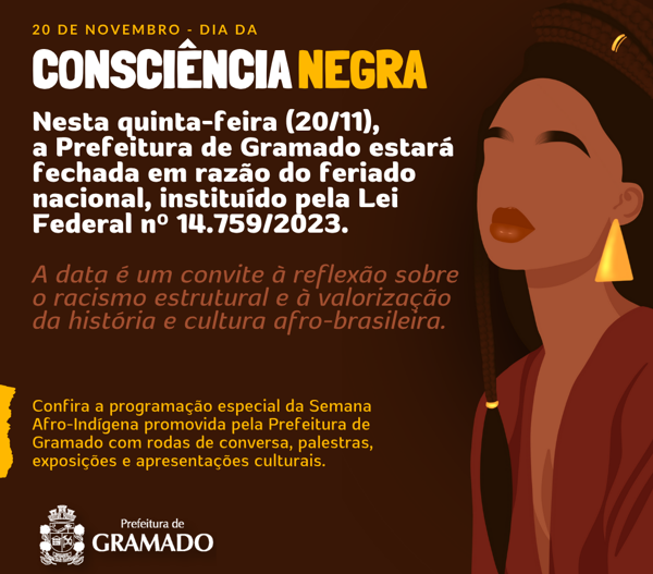 A Prefeitura de Gramado informa que estará fechada nesta quinta-feira, dia 20 de novembro, em razão do feriado nacional do Dia da Consciência Negra, conforme a Lei Federal nº 14.759/2023, que institui a data como feriado em todo o território nacional. O dia 20 de novembro foi escolhido em referência à morte de Zumbi dos Palmares, símbolo da […]