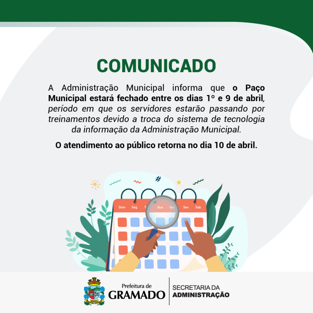 Serviços administrativos da Prefeitura de Gramado estarão suspensos entre 1º e 9 de abril