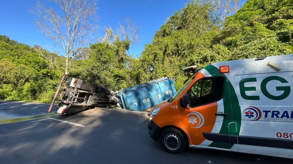 Caminhão carregado de papelão para reciclagem tomba na ERS-115 em Gramado