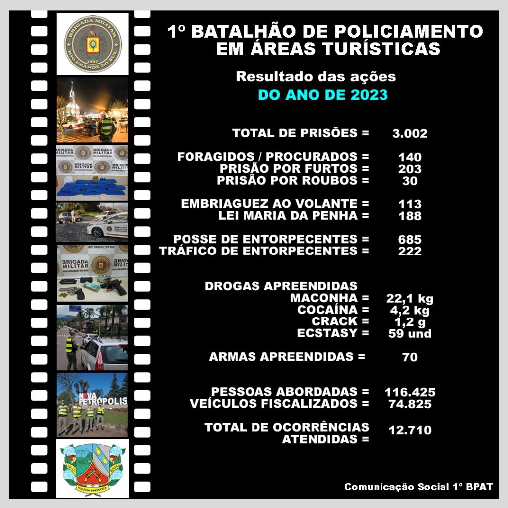O 1º Batalhão de Policiamento em Áreas Turísticas (1º BPAT) finalizou a contabilidade de suas ações, prisões e apreensões, ocorridas no ano de 2023. Foram 12.710 ocorrências atendidas nos dez municípios da área de atuação da Unidade. Em relação ao ano anterior, 2023 teve redução no número de homicídios (33 para 21), no roubo a […]