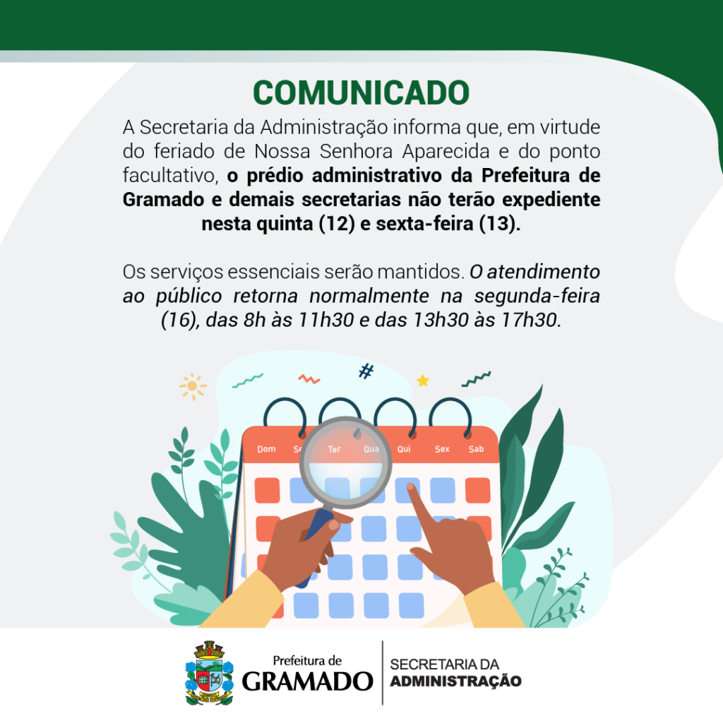 A Secretaria da Administração informa que, em virtude do feriado de Nossa Senhora Aparecida e do ponto facultativo, o prédio administrativo da Prefeitura de Gramado e demais secretarias não terão expediente nesta quinta (12) e sexta-feira (13). Os serviços essenciais serão mantidos. O atendimento ao público retorna normalmente na segunda-feira (16), das 8h às 11h30 […]