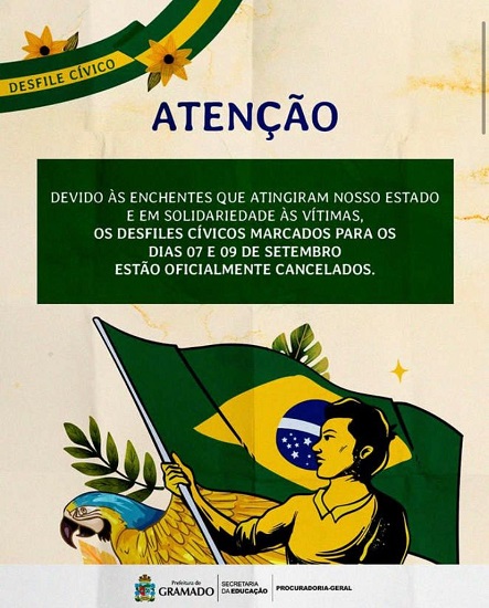 A Prefeitura de Gramado, por meio da Secretaria da Educação e Procuradoria-Geral, informa que os Desfiles Cívicos marcados para os dias 07 e 09 de setembro estão cancelados em solidariedade e respeito às vítimas do ciclone que atingiu o Rio Grande do Sul entre o último domingo (3) e segunda-feira (4). A medida também segue […]